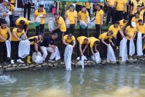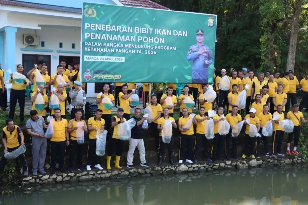 MAROS – Upaya memperkuat ketahanan pangan sekaligus menjaga kelestarian lingkungan terus digencarkan oleh Polres Maros melalui kegiatan penanaman pohon dan penebaran ribuan benih ikan yang berlangsung di kawasan SPPG Polres Maros Kalabbirang, Jumat (24/4/2026).