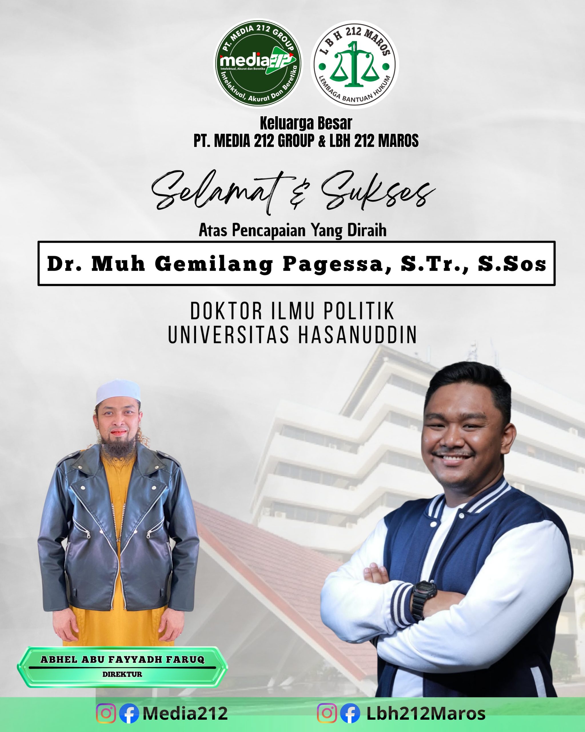 “Atas nama keluarga besar PT. Media 212 Group dan LBH 212 Maros, kami mengucapkan selamat dan sukses kepada Dr. Muh. Gemilang Pagessa, S.Tr., S.Sos., atas diraihnya gelar Doktor Ilmu Politik di usia yang sangat muda. Ini adalah prestasi yang membanggakan bagi Kabupaten Maros,” ujar Abhel.