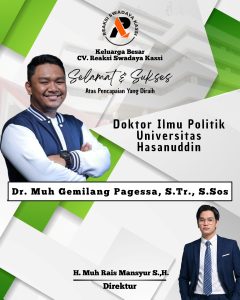 “Atas nama Keluarga Besar CV. Reaksi Swadaya Aksi, kami mengucapkan selamat dan sukses kepada Dr. Muh. Gemilang Pagessa, S.Tr., S.Sos., atas diraihnya gelar Doktor Ilmu Politik di usia yang sangat muda. Ini adalah kebanggaan bagi masyarakat Kabupaten Maros,” ujar H. Muhammad Rais Mansyur, S.H.