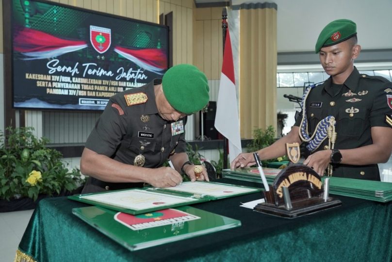 Makassar – Pangdam XIV/Hasanuddin memimpin langsung upacara Serah Terima Jabatan (Sertijab) sejumlah pejabat utama Kodam XIV/Hasanuddin di Markas Kodam, Makassar, Jl. Urip Sumoharjo, Kota Makassar. Selasa, (30/9/2025).
